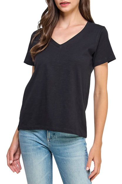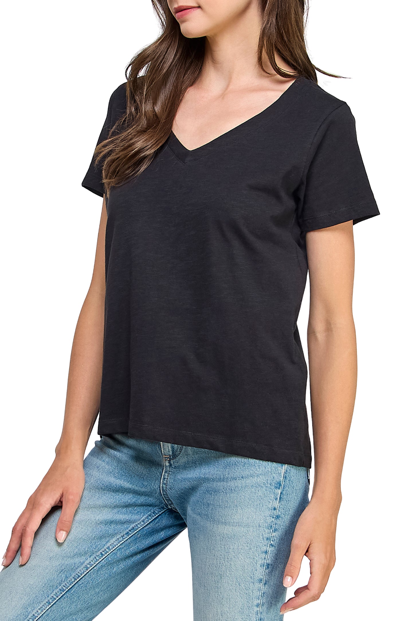 Women's GOTS Certified 100% Organic Cotton Black Slub V-Neck T Shirt Short Sleeve Tee Tops